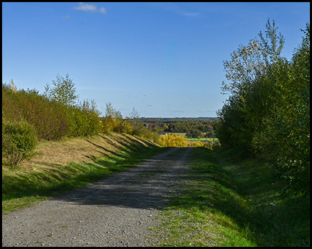 Zu Fuß etwa 250 m hinter der Straßenkreuzung und der alten Eisenbahnbrücke rechts in den Neuhammerweg und geradeaus an der alten Markenkontrolle vorbei und immer bergauf zur Halde.