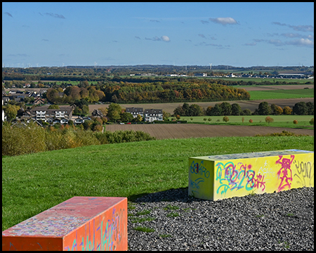 Gipfelplateau der Halde Schleswig mit Sitzsteinen und Aussicht auf die Umgebung
