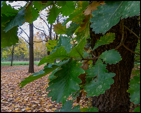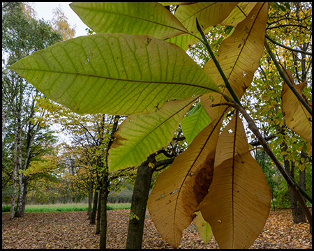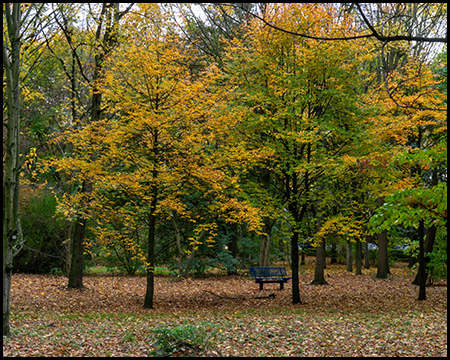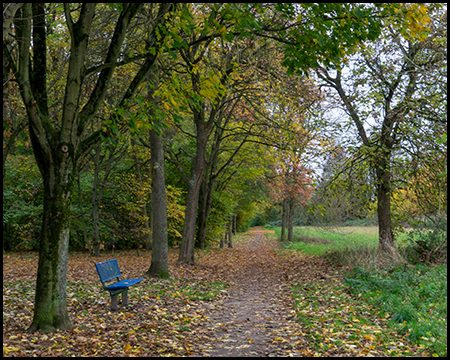 Im Herbst zeigt sich der Gehölzgarten Ripshorst von einer besonders warmen, farbintensiven Seite. Zwischen den geschwungenen Wegen leuchten die Gehölze in kräftigen Gelb-, Orange- und Rottönen und setzen markante Akzente in der weitläufigen Landschaft. Die Waldränder am Haus Ripshorst wirken nun fast wie farbige Korridore, während sich auf den Wiesen und am Ufer des Kanals ein Teppich aus herabfallenden Blättern sammelt.