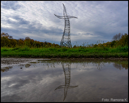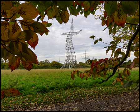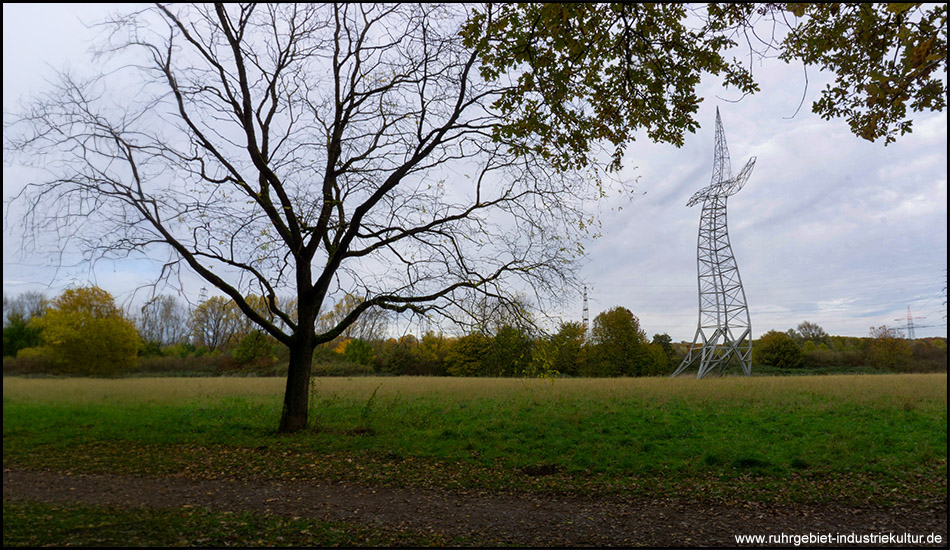 Man hat in den Fotos richtig gesehen: einer der Strommasten tanzt aus der Reihe und zeigt menschliche Züge – es ist der Zauberlehrling, Wahrzeichen des Gehölzgartens.