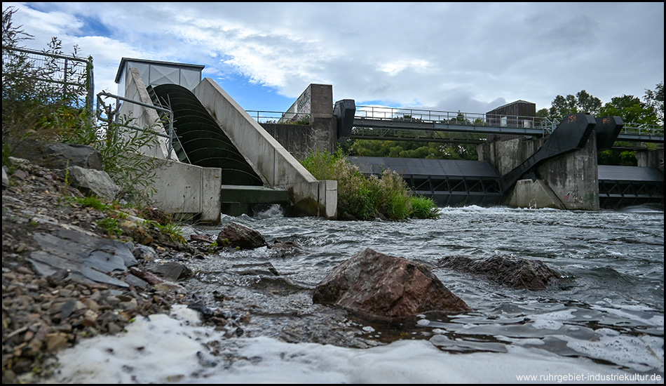 Am Stauwehr dreht sich eine Schnecke und erzeugt elektrische Energie. Daneben plätschert die Fischtreppe in einem Labyrinth aus Betonstegen und ermöglicht Fischen die barrierefreie Bewegung auf- und abwärts der Ruhr.