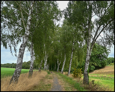 Hinter dem zweiten Hügel verlassen wir die Ruhr und wandern durch die Felder Richtung Wickede weiter. Dann wenden wir uns den Häusern von Frohnhausen zu und gelangen nach einigen Straßenüberquerungen zu einer lichten 5 Birkenallee am Naturschutzgebiet Wulmke. Von hier steigt die Route allmählich an. Eine Bank unter einem 6 Baum bietet sich als Rastplatz nach dem sanften, aber langgezogenen Anstieg an.