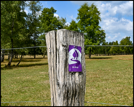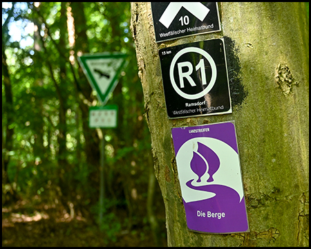 Die Beschilderung ist, wie bei allen Landstreifern, gut gelöst: Lilafarbene Piktogramme mit dem Schriftzug „Die Berge“ weisen zuverlässig den Weg – und das in beide Richtungen. Trotzdem lohnt es sich, gerade im Bereich des Hubertusplatzes (Ausgangspunkt dieser Tourbeschreibung) genau hinzusehen oder einen GPS-Track mitzunehmen, denn die vielen Richtungswechsel können hier leicht zu einem unfreiwilligen Umweg führen.