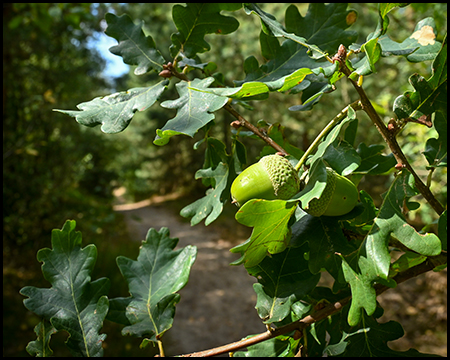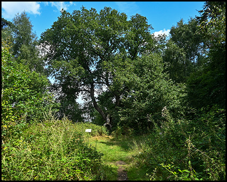 Schon bald erreicht man das Naturschutzgebiet Lünsberg. Der gleichnamige Hügel erhebt sich hier auf etwa 93 Meter, was im Münsterland wirklich fast ein „Gipfel“ ist. Man nimmt die Höhe vor allem daran wahr, dass sich der Weg sanft, aber stetig bergauf schlängelt. Die Bäume stehen im Sommer dicht, und größere Ausblicke bleiben aus. Auf dem höchsten Punkt steht jedoch ein besonderes Naturdenkmal: die alte Eiche. Sie ist die letzte Überlebende einer Reihe von Eichen, die einst den Gipfel zierten.