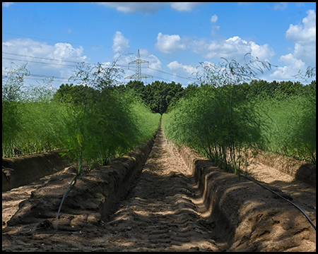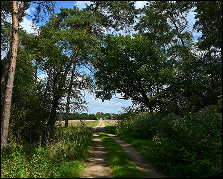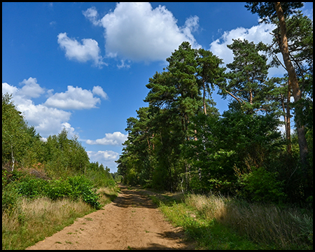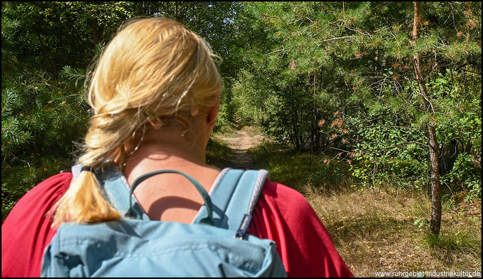 Durch den Wald und eine Freifläche zwischen landwirtschaftlichen Flächen geht es zurück nach Osten. Im letzten Abschnitt wartet der höchste der fünf Hügel: der Tannenbültenberg mit rund 100 Metern Höhe. Wir umrunden ihn allerdings und erklimmen ihn nicht. Der lockere, fast feine Sand auf dem Weg wirkt wie ein Meeresstrand unter den Füßen. Schritt für Schritt sinkt man leicht ein, was den Weg sportlich herausfordernd macht. Es duftet ein bisschen nach Urlaub und mit etwas Phantasie sind es nicht die Bäume, die im Wind rauschen, sondern die Wellen an der Küste.