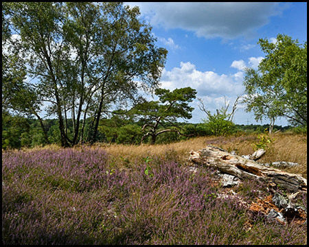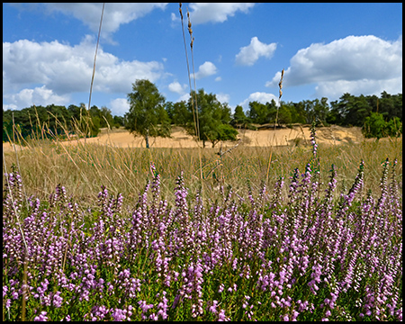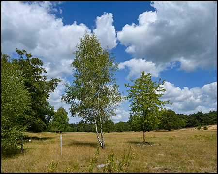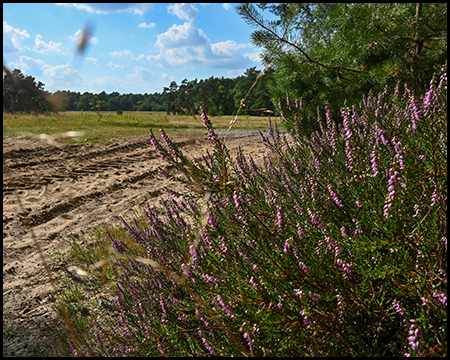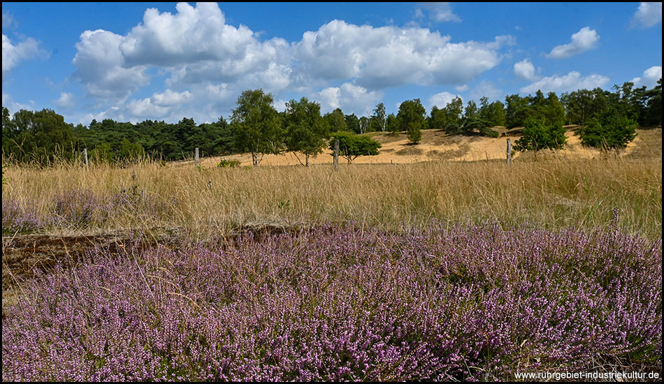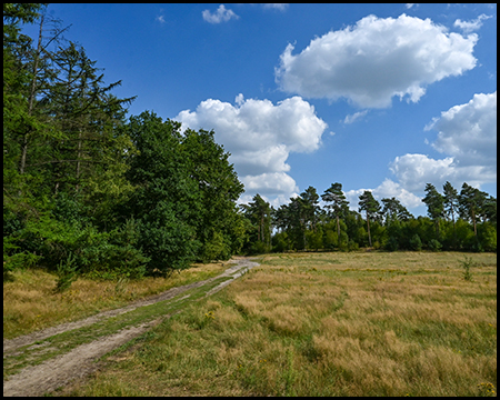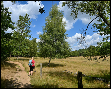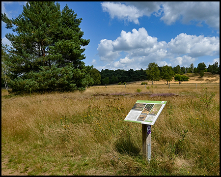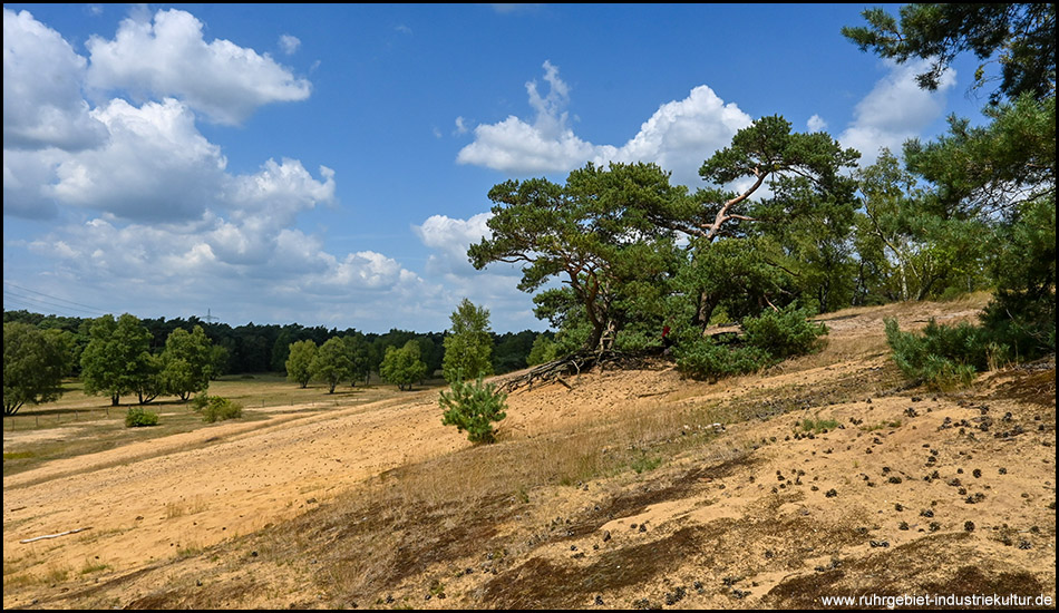 Der Weg führt weiter durch den Wald und schließlich in eine offene Heidelandschaft. Hier befindet sich der Fliegerberg, mit 85 Metern vierthöchster Hügel der „Berge“. Die freie Fläche zu seinen Füßen ist ein starker Kontrast zu den schattigen Waldabschnitten.