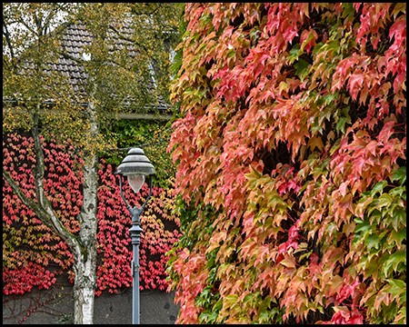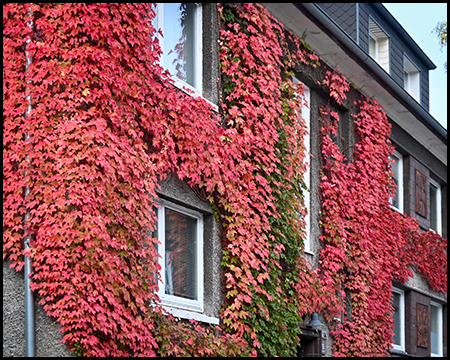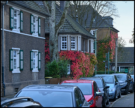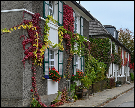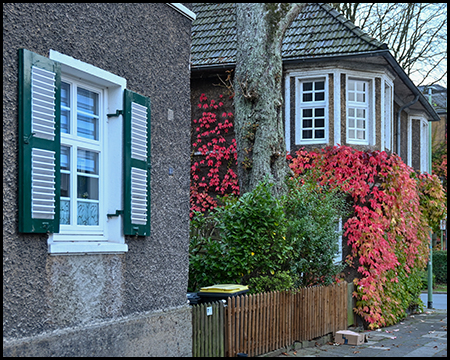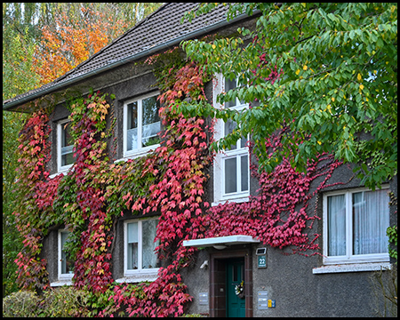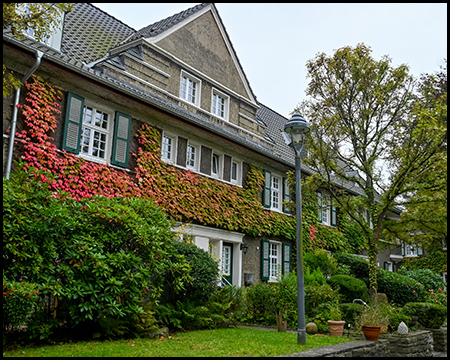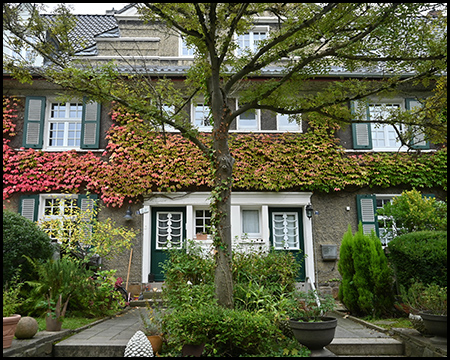Die Siedlung Margarethenhöhe entfaltet im Herbst einen ganz eigenen Zauber. Viele der historischen Häuser sind von wildem Wein umrankt, der sich nun in leuchtenden Farben zeigt – von sattem Grün über warmes Orange bis hin zu tiefem Rot. In den Straßen entsteht so ein malerisches Bild, das den Gartenstadt-Charakter der Margarethenhöhe besonders eindrucksvoll unterstreicht.