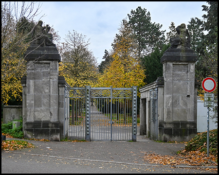 Der Ostfriedhof Essen liegt im Essener Südostviertel und bildet ein stilles, grünes Fünfeck mitten im Wohngebiet. Zwischen Saarbrücker Straße, Schinkelstraße und Herwarthstraße öffnet sich eine Anlage, die seit ihrer Inbetriebnahme im Jahr 1895 zu den wichtigen städtischen Erinnerungsräumen zählt. Der Haupteingang an der Saarbrücker Straße ist ein markantes Element. Das Tor-Portal von 1910, entworfen von Edmund Körner, hat steinernen Säulen mit Figuren darauf und ein schweres Eisentor. Wir betreten den Friedhof durch dieses Tor. Die Verlängerung der Steubenstraße führt als Hauptachse und Allee tief in den Friedhof hinein.