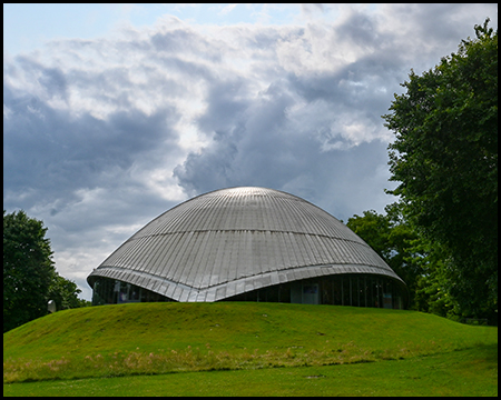 Von außen wirkt der Bau wie ein gelandetes Ufo aus der Zukunftsvision von 1964 – dem Jahr seiner Entstehung. Beton dominiert, und zwar selbstbewusst. Das Dach ist mit in der Sonne glänzendem Edelstahl belegt.
