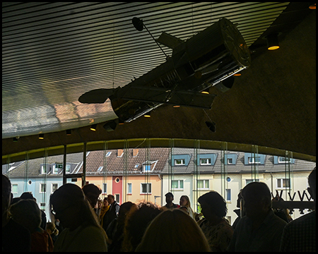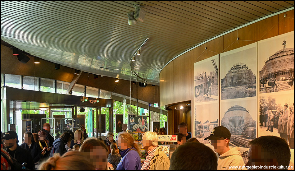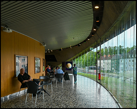 Rund um den Saal zieht sich ein ringförmiger Gang mit Café, Astro-Shop, Garderobe und wechselnde Ausstellungen für die, die nach dem Blick ins All noch etwas Greifbares brauchen. Da die Kuppel selbsttragend ist, ergeben sich an drei Stellen hohe und langgestreckte Fensterbögen.