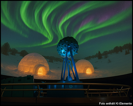 Während der Vorstellung ist Fotografieren oder Filmen nicht erlaubt. Um dennoch einen ungefähren Eindruck zu bekommen, wie es ungefähr aussieht, sind in den nachfolgenden Fotos Sternenhimmel sowie Nordlichter mittels KI künstlich eingesetzt. Es handelt sich explizit nicht um Abbildungen aus einer Vorstellung.