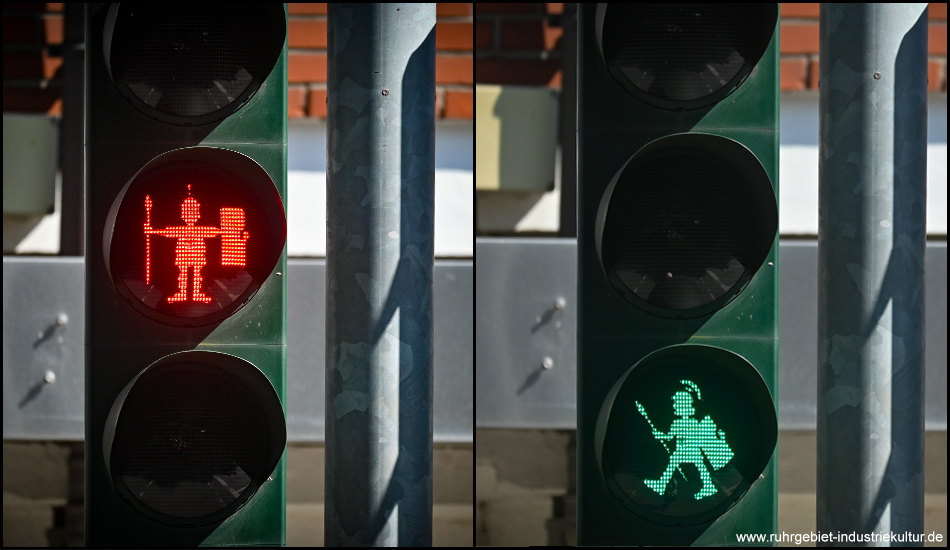 Stadtmuseums in Oberaden. Auf dem Schild ist die Laufrichtung mithilfe einer Hand angegeben. Daneben befindet sich auf jedem Schild ein Schrägluftbild mit eingezeichnetem Pfad. Schon bald entdeckt man diese Hand als Wegepiktogramm an interessant gestalteten Schildern wieder. Auf dem Boden finden sich am Anfang hier und dort zur weiteren Hilfe gemalte Fußtritte.