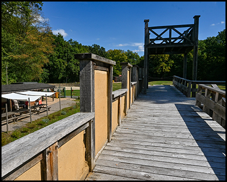Der Wehrgang ist über eine Rampe zu besteigen. Hier lassen sich auch Erkenntnisse über Baustoffe und -Technik gewinnen. Die Mauer war einst 3 Kilometer lang und hatte 120 derartige Türme. Unterbrochen war die Mauer durch vier Tore, von denen das hier befindliche Nordtor derzeit ebenfalls nachgebaut wird.