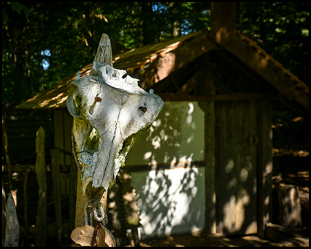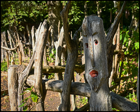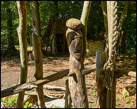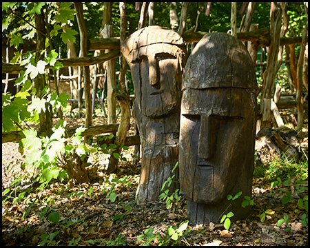 Holzskulptur mit verschiedenen Köpfen zu sehen.