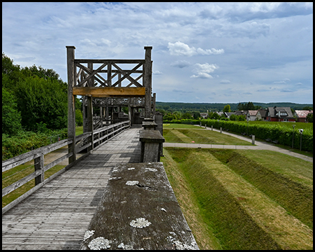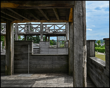 Die Mauer ist über Treppen oder eine Rampe begehbar. Der Blick von oben zwischen den hölzernen Zinnen gibt eine Ahnung davon, wie groß und wehrhaft das Lager einst war. Vielleicht spürt man hier sogar die Gedanken eines Legionärs, der an einer lauen Nacht Wache stand: weit entfernt von Rom, in einem fremden Land, im feuchten und kühlen Norden. Er blickte in die Dunkelheit hinaus, lauschend auf jedes Geräusch, wissend, dass er Teil einer gewaltigen Armee war – und doch allein in seiner Verantwortung, das Lager zu beschützen.