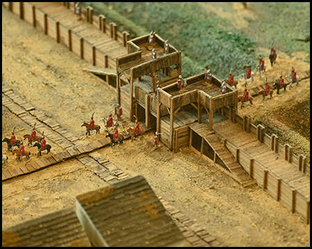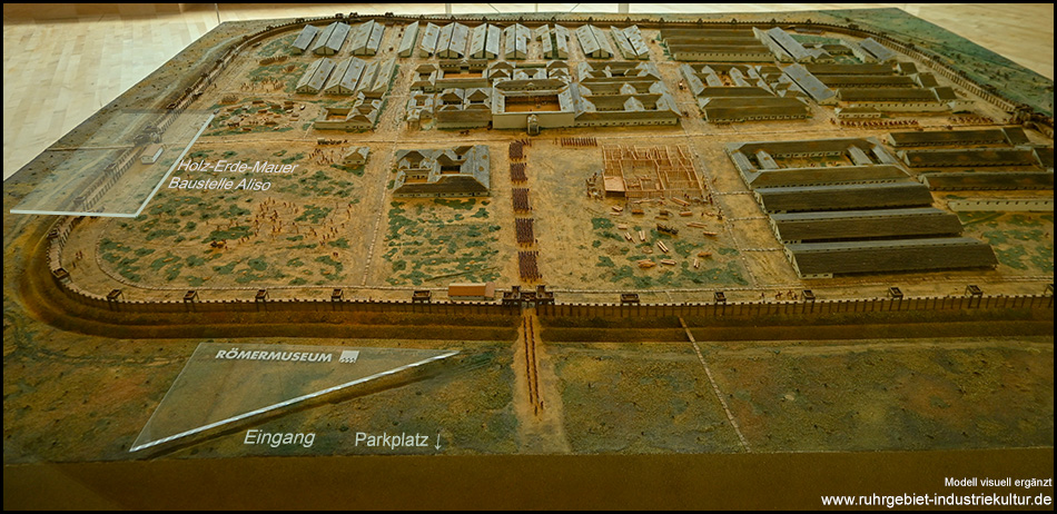Betritt man das Außengelände, erblickt man schräg vor sich eine beeindruckende Holz-Erde-Mauer, flankiert von zwei parallel verlaufenden Gräben, mehreren Wachtürmen und dem Westtor. Das Holztor darin steht offen, sodass man das alte Römerlager betreten könnte (auf dem sich heute moderne Ein- oder Mehrfamilienhäuser und Gärten mit Pools und Trampolinen befinden). Wichtig ist nur, dass man das farbige Armband trägt, das man an der Museumskasse erworben hat – falls die Wache danach fragt. Die allerdings spricht (vermutlich) nicht lateinisch, ist Angestellter des Museums und erklärt auch mal das ein oder andere.