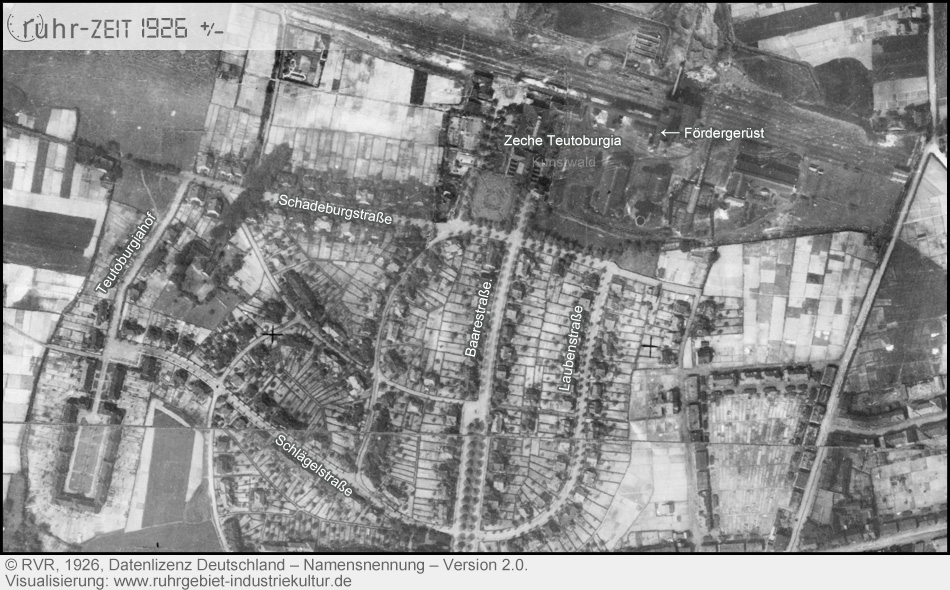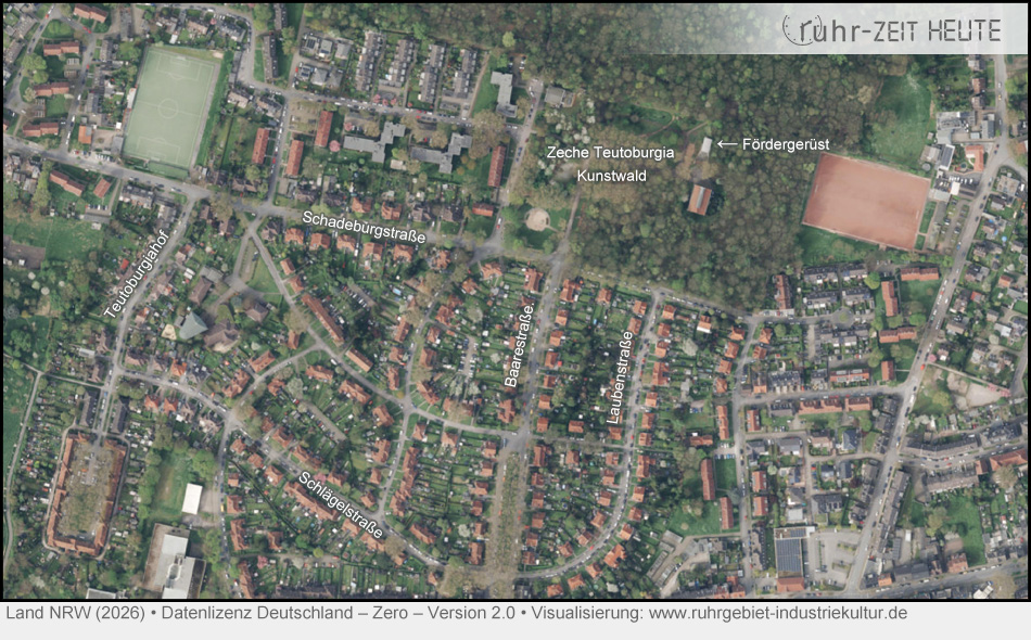Im Norden stößt man bei dem Spaziergang auf das markante Fördergerüst der Zeche. Es ist als Denkmal erhalten und bildet ein Wahrzeichen in einem kleinen Park, dem Kunstwald Teutoburgia. Im folgenden Luftbild sind die Lage des Kunstwaldes und der Zechensiedlung gut zu erkennen. Darin sind auch die größten verbliebenen Bauten zu sehen, der Förderturm und die Maschinenhalle von Schacht I.