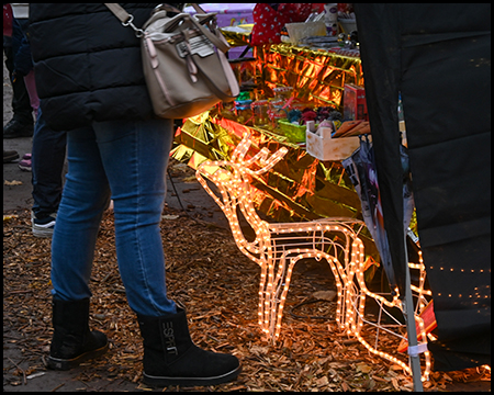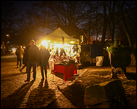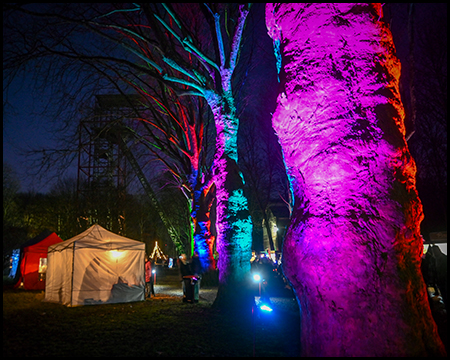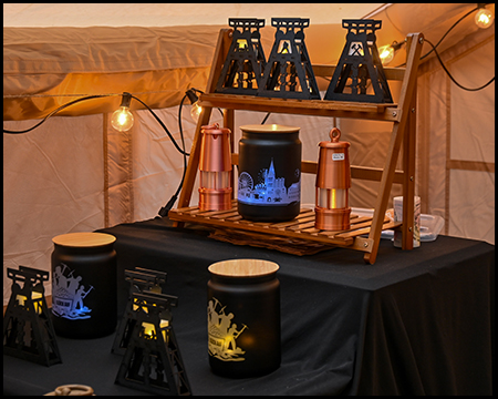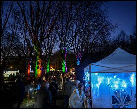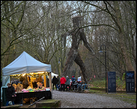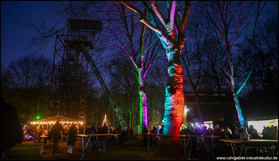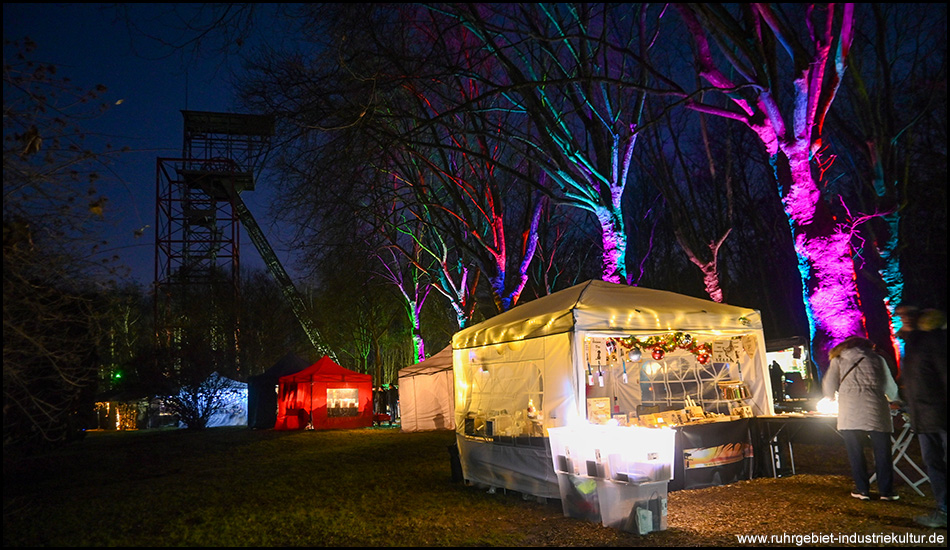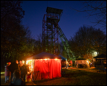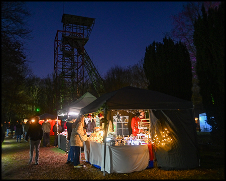 Besonders nach Einbruch der Dunkelheit entfaltet der Kunstwald eine besondere Atmosphäre: Feuerstellen spenden Wärme, Bäume sind beleuchtet und zwischen den Wegen verteilen sich die Buden wie Lichtinseln im Park. Statt großer Kulissen stehen handwerkliche Stände im Mittelpunkt, an denen Kunsthandwerk und liebevoll gestaltete Kleinigkeiten angeboten werden. Für das leibliche Wohl ist ebenfalls gesorgt. Mit Glühwein und Bratwurst, passend zur Jahreszeit und ohne überladen zu wirken. Der Markt bleibt bewusst überschaubar, wirkt dadurch aber umso stimmiger: kein Trubel, sondern ein ruhiger, stilvoller Ort, der die besondere Kulisse der ehemaligen Zeche und des Waldes in der Adventszeit wirkungsvoll zur Geltung bringt. Der Spaziergang durch die festlich beleuchtete Siedlung ist hinterher ein „Muss“.