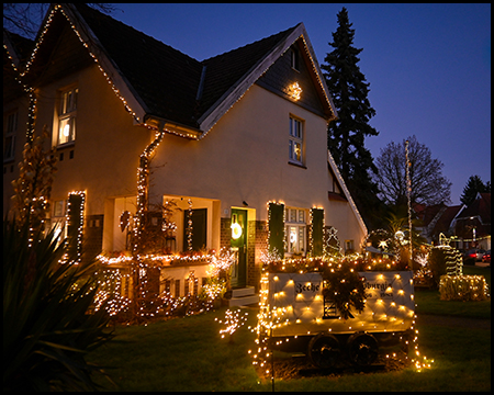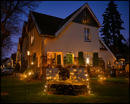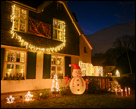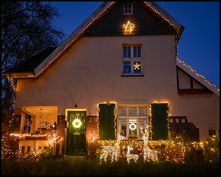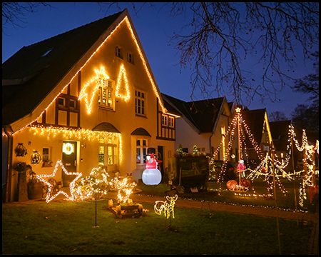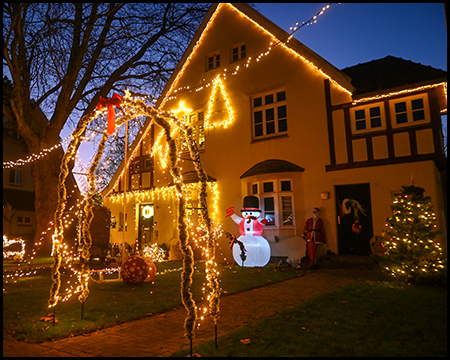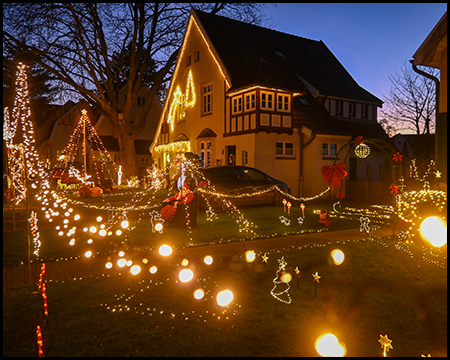 Zweimal im Jahr verwandelt sich die Siedlung Teutoburgia – Zu Halloween und zu Weihnachten. In der Adventszeit ist es ein fast schon überwältigendes Lichtermeer. Lichterketten ziehen sich über Hausfassaden und Dachgiebel, leuchten in Vorgärten, rahmen Zäune und Fenster ein. Dazwischen stehen Schneemänner, Weihnachtsmänner und Rentiere, teils klassisch weiß beleuchtet, teils bunt blinkend, gelegentlich sogar begleitet von Musik oder Soundeffekten.