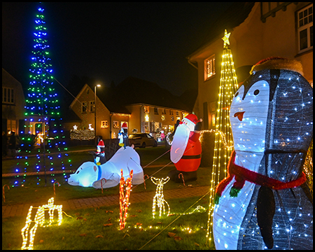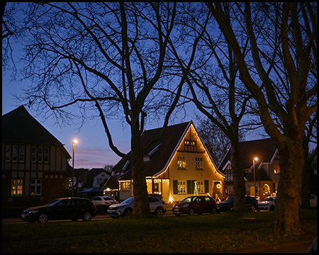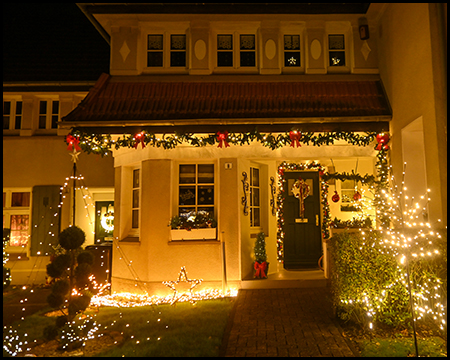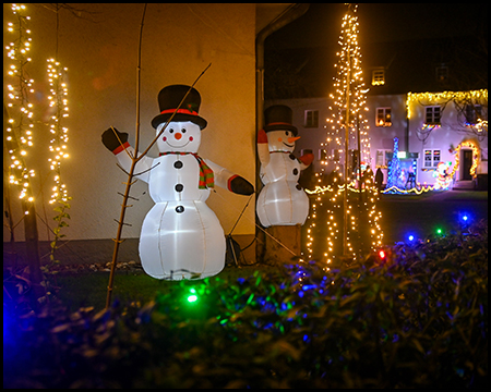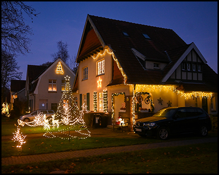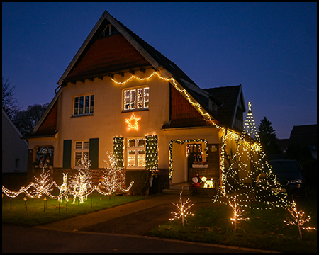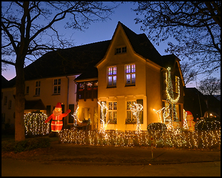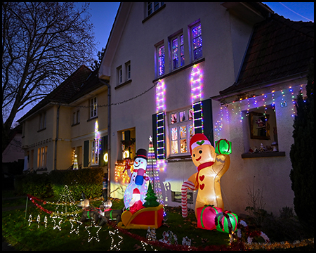 Die Weihnachtsbeleuchtung in der Siedlung ist vom öffentlichen Raum aus gut sichtbar. Alle Fotos in diesem Beitrag wurden von Straßen und Gehwegen aufgenommen. Wer selbst auf Entdeckungstour geht, tut dies am besten mit Rücksicht – private Grundstücke bleiben privat, auch wenn sie noch so schön geschmückt sind.