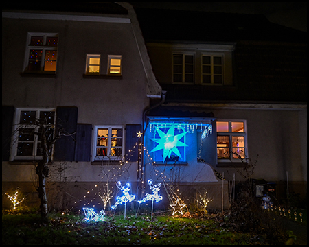 Die festliche Dekoration ist dabei so vielfältig wie die Siedlung selbst: von zurückhaltend und elegant bis bewusst kitschig und farbenfroh. Große und kleine Sterne hängen in Fenstern, schweben über Eingängen oder leuchten frei im Garten, ergänzt durch Projektionen, die Motive auf Leinwände oder direkt auf Hausfassaden werfen. Kaum biegt man um eine Straßenecke, eröffnet sich ein neues Bild – oft noch heller, noch verspielter als zuvor.