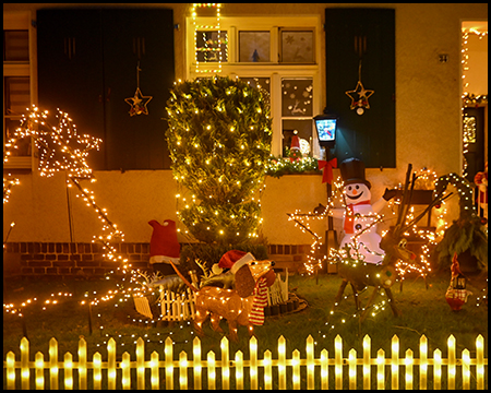 Menschen streifen durch die Straßen und bewundern die Weihnachts-Deko in den Gärten
