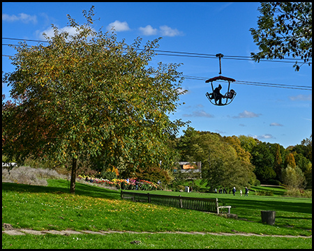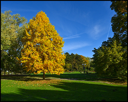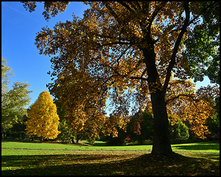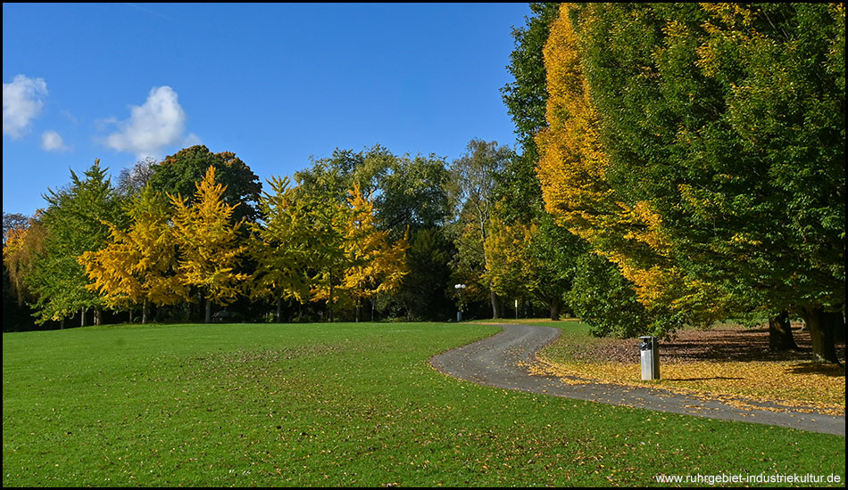 Im Herbst verwandelt sich der Westfalenpark in einen bunten Ort. Die großen Alleen leuchten in warmen Farben, das Laub der alten Bäume raschelt unter den Füßen. Im Rosarium sind die meisten Blüten verblüht, doch einzelne späte Sorten setzen noch Farbakzente zwischen bronzefarbenen Beeten. Die Dahlien zeigen meist noch ihre volle Pracht, zumindest bis zum ersten Bodenfrost, nur einige Sorten sind schon verblüht und bereiten ihre Knollen auf das Winterquartier vor.