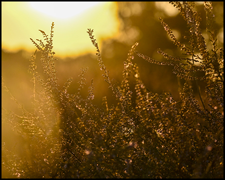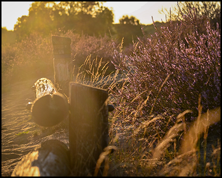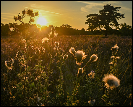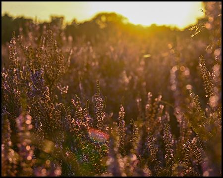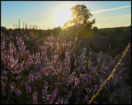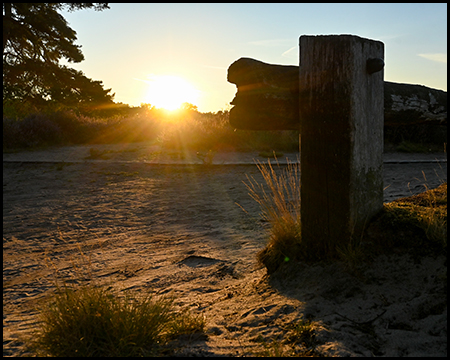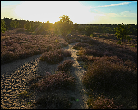Am besten ist der Blick von der Aussichtsdüne, wo man in westlicher Richtung über die blühenden Felder dorthin schaut, wo die Sonne hinter dem Wald untergeht.
