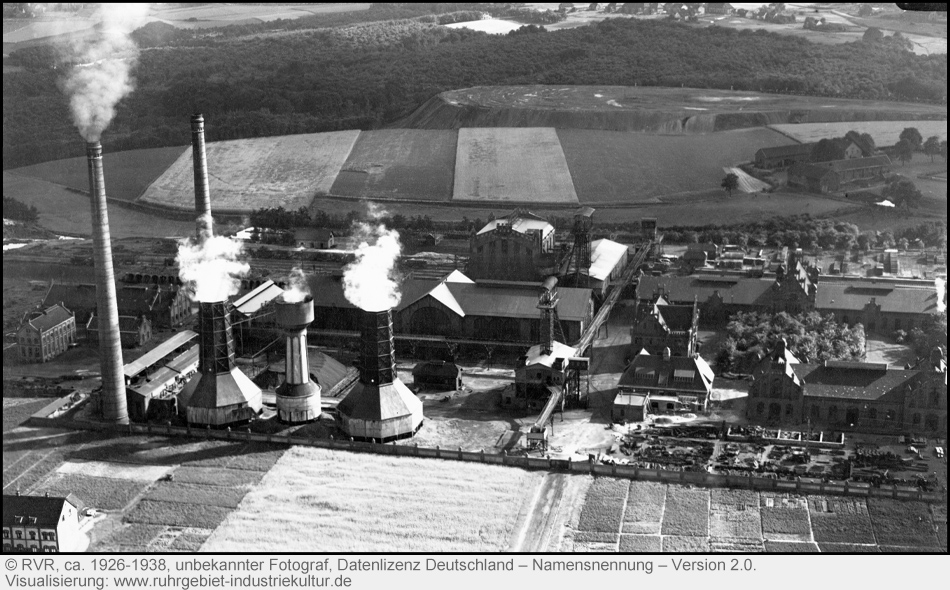 Das folgende Luftbild von 1935 zeigt die Zeche. Die rot markierten Gebäude sind heute noch erhalten. Im Vordergrund ist die große Haldenfläche zu sehen, die heute den Park darstellt.
