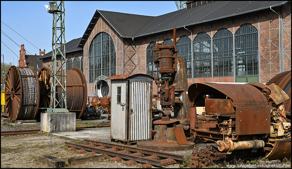 Am Vorplatz vor der großen Maschinenhalle befindet sich der Zechenbahnhof, den man ebenfalls erkunden kann. Nur das Besteigen der Wagen und Lokomotiven ist nicht erlaubt. Hier sind viele Loren und Grubenloks in der schmalen Spur ebenso wie Waggons in der Normalspur zu besichtigen. Fachleute werden sich über alte Schilder, Weichenlaternen und Wasserkran freuen.