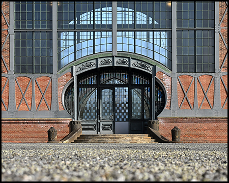 Hier am Zechenplatz südlich der Halle befindet sich das große Jugendstil-Portal, das sogar schon einmal eine Briefmarke geschmückt hat. Lediglich das ursprüngliche ausladende Vordach im gleichen Baustil ist heute nicht mehr erhalten.