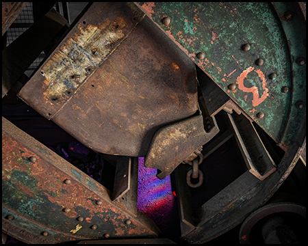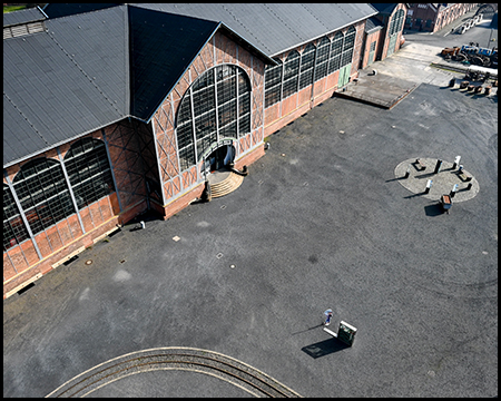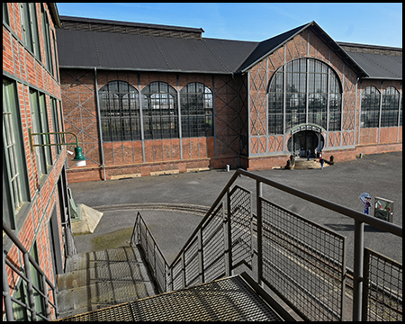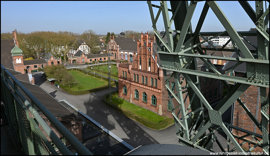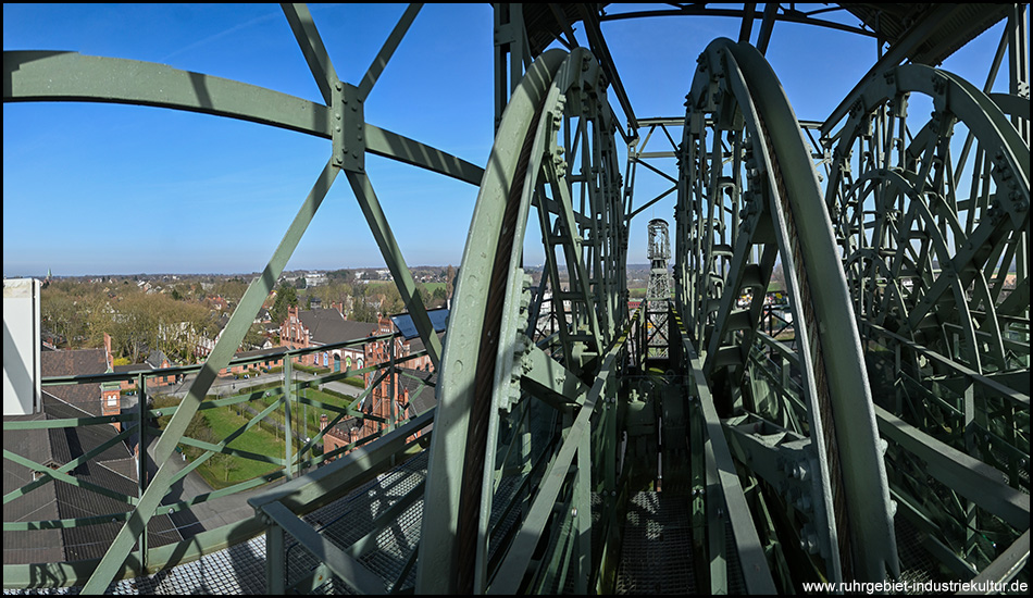 Immer weiter hinauf geht es, bis man dann auf der Aussichtsplattform bei den Seilscheiben steht. Von hier oben ergibt sich ein besonders schöner Blick auf den Kernbereich der Zeche mit allen Gebäuden und auf den Vorplatz der Maschinenhalle mit dem Güterbahnhof.