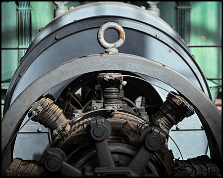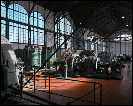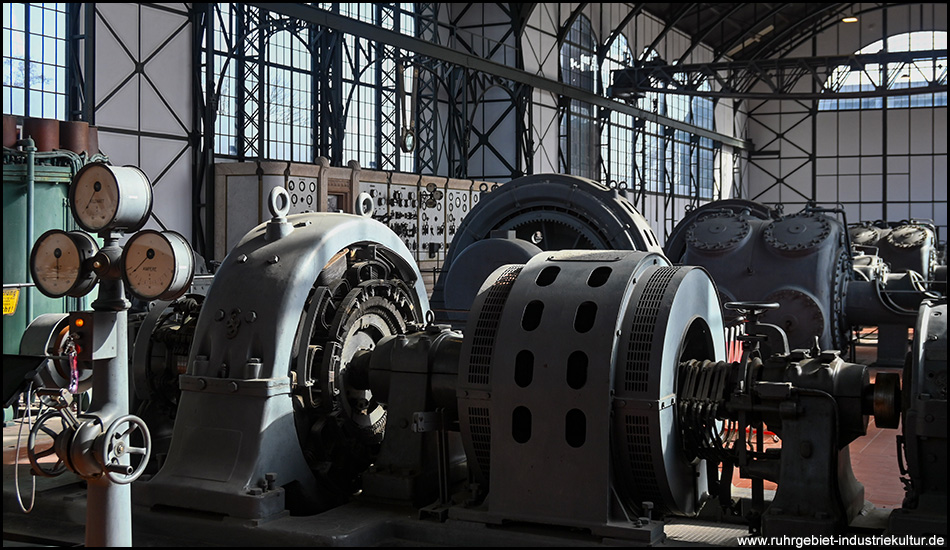 Ein wenig ehrfürchtig steigt man die Treppen hoch und gelangt durch eine kleine Schwingtür des Vorraums in die Halle. Vor uns befinden sich unterschiedlichste Maschinen und Anlagen, die sich uns Laien auf dem ersten Blick keiner Funktion zuordnen lassen. Über uns hängt ein Hallenkran. Da sind riesige Elektromotoren und Wandler. Das Seil vom Fördergerüst führt durch Gebäudeöffnungen an der Seite zur Fördermaschine. Auf Plaketten entdeckt man historische, heute teilweise gar nicht mehr existierende Firmen oder Kooperationen oder alte Firmenlogos, wie beispielsweise das von Siemens-Schuckert, Siemens & Halske und einige andere.