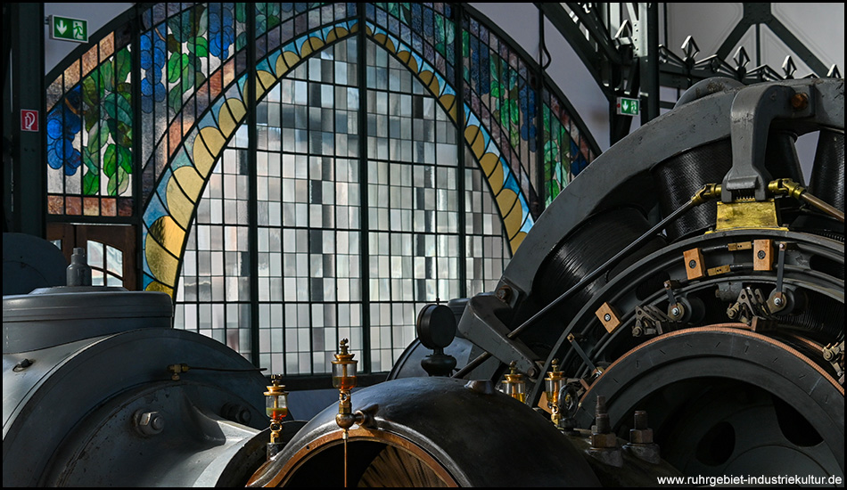 Die Maschinenhalle liegt unmittelbar hinter der Alten Verwaltung und ist das größte einzelstehende Gebäude der Zechenanlage. Sie wurde 1903 fertiggestellt und stammt vom Architekten Bruno Möhring (1863-1929). Ihre Eigenart ist die filigrane Eisenfachwerk-Konstruktion, die durch ihre Alleinstellung wesentlich zum Erhalt der gesamten Anlage beigetragen hat, wie wir sie heute besichtigen können. Schon von außen beeindruckt die Halle.
