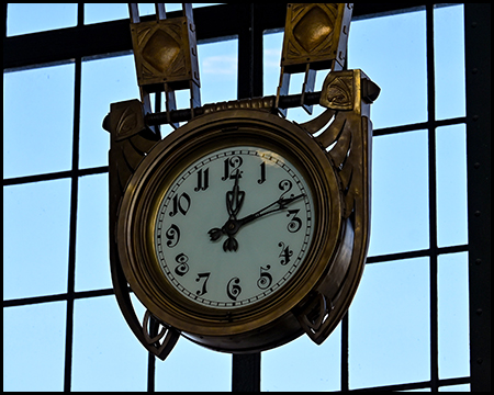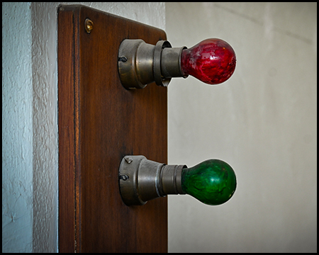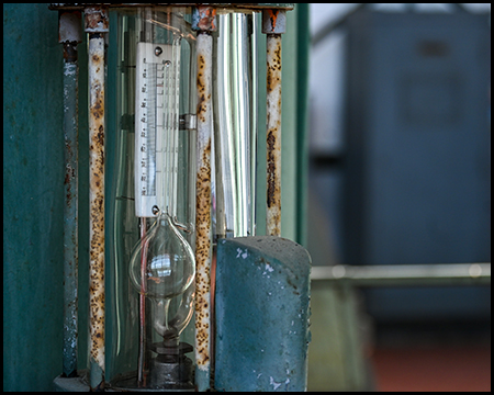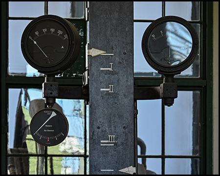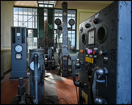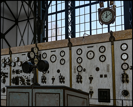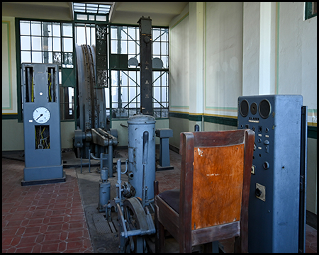 Nicht weniger beeindruckend ist die Schalttafel an der östlichen Seite der Halle, die aus einer langen Wand aus Marmor besteht. Schalter, Sicherungen, Hebel und Messgeräte aus glänzenden Materialien sind daran angebracht.