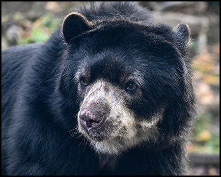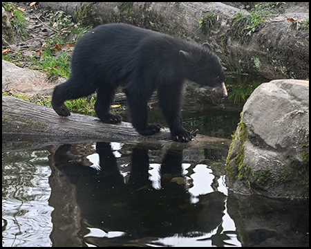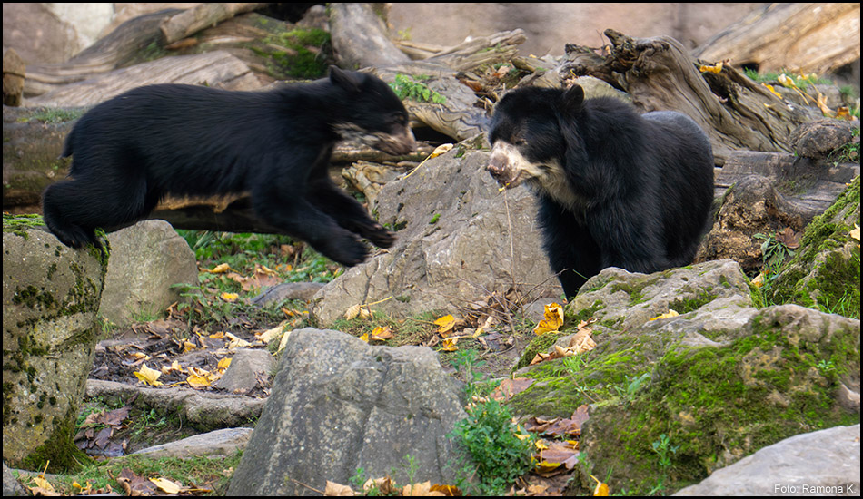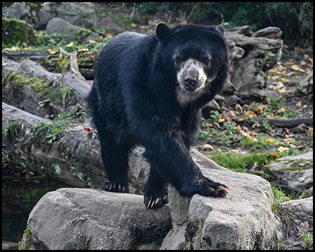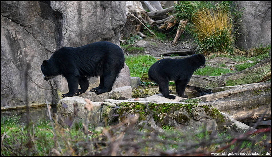 Gleich von mehreren Seiten lässt sich das felsige Gehege mit den Brillenbären einsehen. Ein Gebirgsbach fließt hindurch, es gibt Wasserfälle und umgefallene Bäume.
